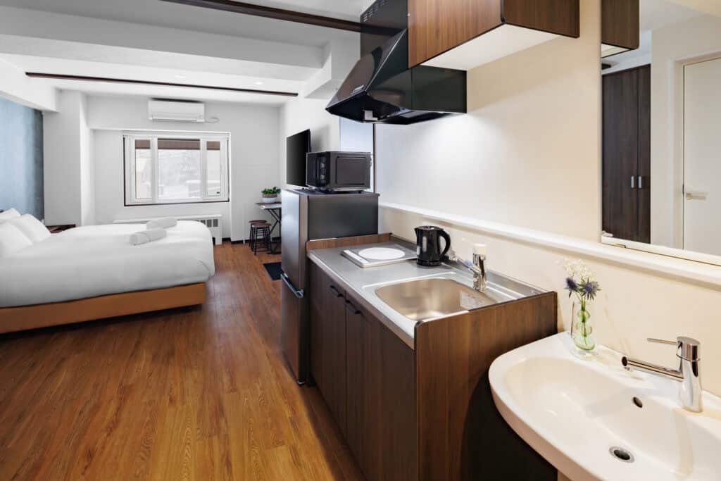 Mizuho Studios delivers the best of both worlds: modern, self-contained comfort with an unbeatable location. Each spacious studio features a king bed (or twin), ensuite with walk-in shower, smart TV, wardrobe, and a handy kitchenette – ideal for couples, friends, or solo travelers. Plus there’s a brand-new café/ restaurant on site, serving delicious breakfast, lunch and dinner options.
