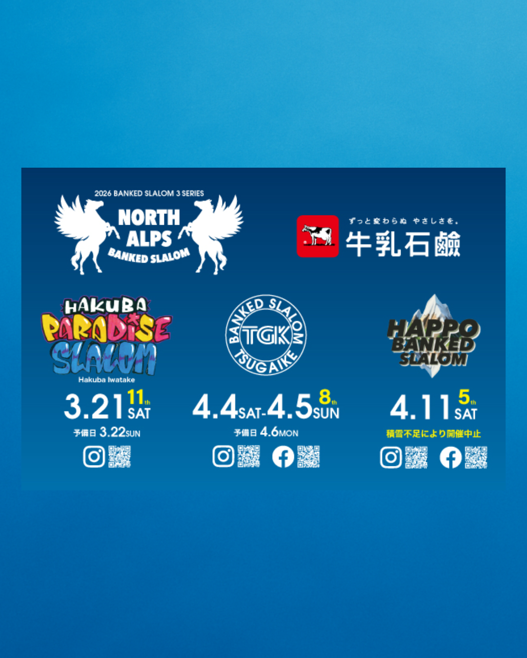 The 2026 BANKED SLALOM TGK at Tsugaike Mountain Resort is a two day competition held on April 4th and 5th, serving as the second leg of the North Alps Banked Slalom 3 Series. Sponsored by Cow Brand Soap, the event features a diverse range of categories, including Snowboard and Snowskate on Saturday, followed by Ski, Snowbike, and Parent/Child divisions on Sunday at the Hannoki Special Course. With a strict limit of 260 participants per day, the festival offers top finishers exclusive prizes, such as a three-mountain season pass for snowboard class winners.