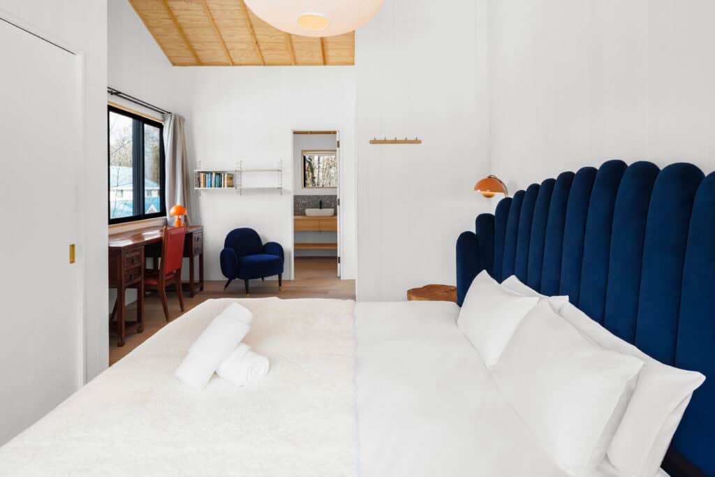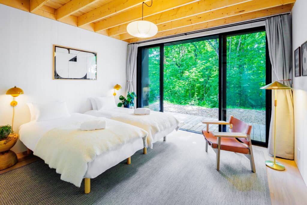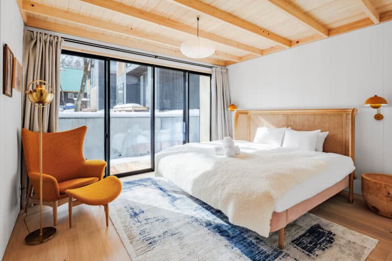 The Boots Off Collection consists of 3 newly built chalets located in Hakuba’s Misorano neighborhood, just a short walk from dozens of bars and restaurants. The first of the collection, Genepi features four bedrooms accommodating up to eight guests, along with three bathrooms. Upstairs guests will find a spacious living and dining area centered around a fireplace, perfect for relaxing after a day on the slopes. Upstairs, guests can enjoy a fully equipped modern kitchen and a covered balcony, perfect for taking in the surrounding forest year round.